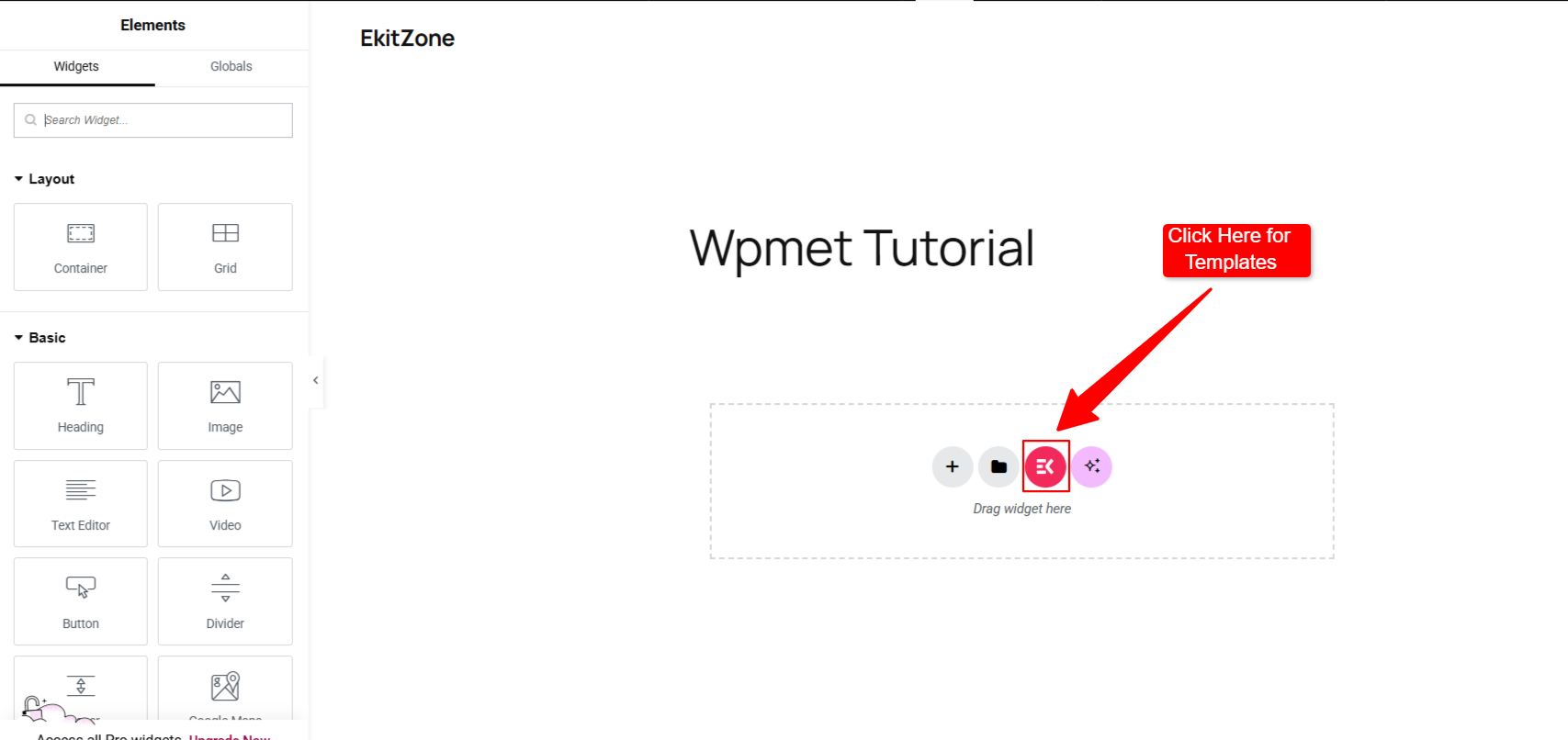 Then, once you’re in the Elementor editor, look for the ElementsKit icon to open the ElementsKit template library.