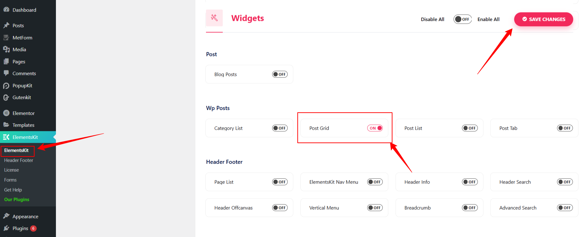 ✅ Enable the Post Grid Widget: Navigate to the ElementsKit dashboard and ensure the “Post Grid” widget is toggled ON.