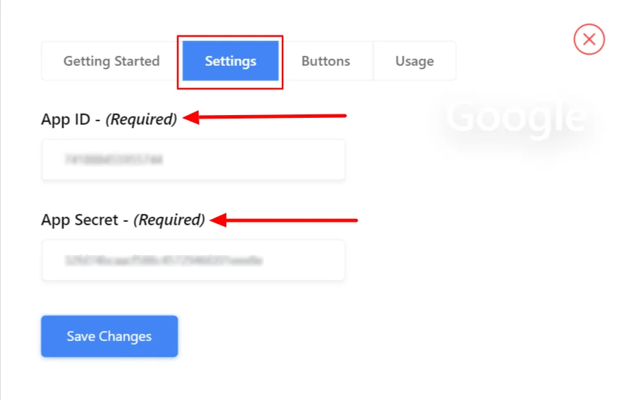 - Click Settings under Google: Find Google in the list and click on Settings. This will open a pop-up where you can add the credentials from your Google app.