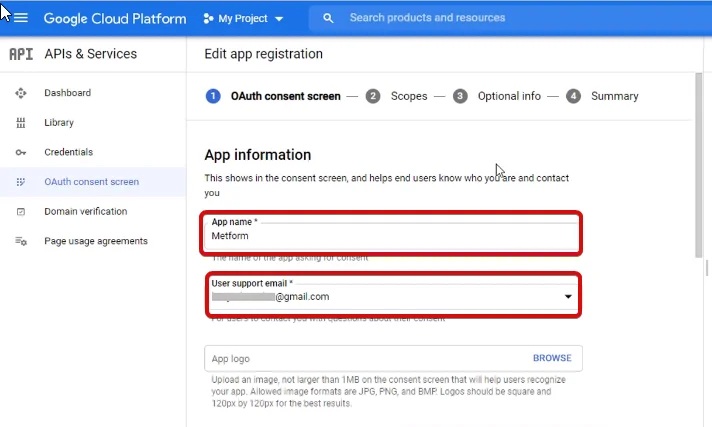 Next, enter the App informations like application name, user support email, and a logo. In the App Name field, type in a name for your app. This is what users will see, so choose something clear and recognizable. Also provide an Brugersupport e-mail where the user can contact for any kind of issue. If you want, you can add an logo for this application.