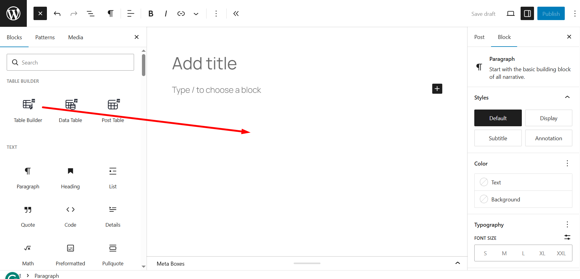 Drag and drop the Table Builder block of TableKit.