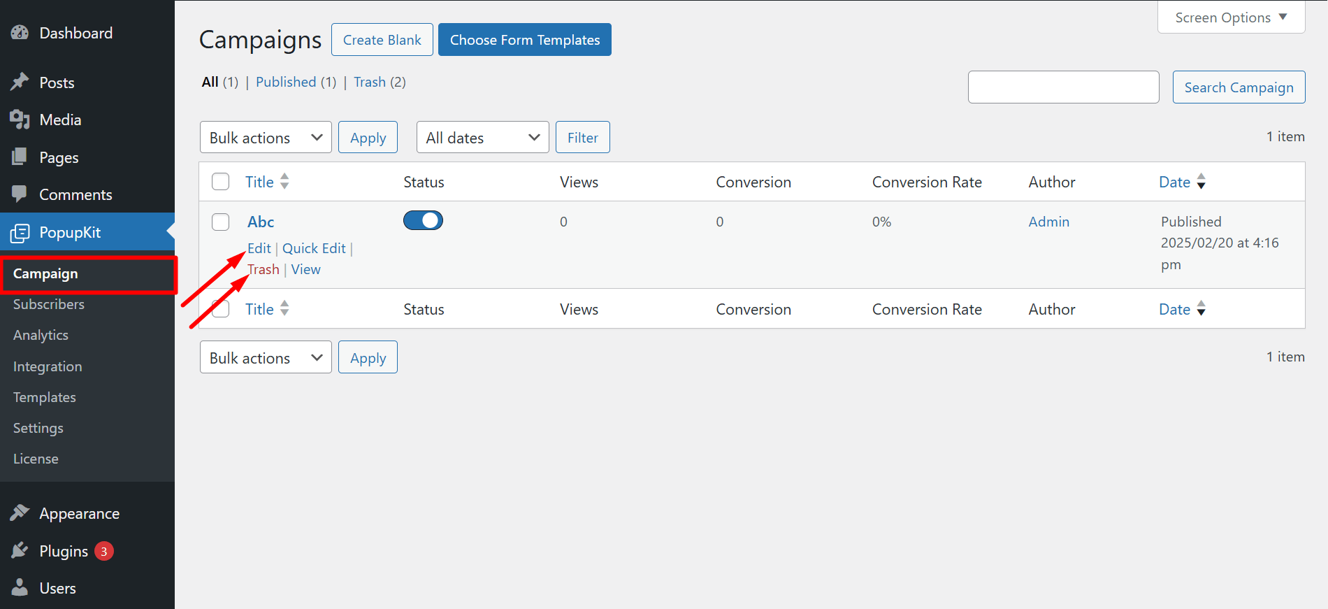 You can easily edit or delete a campaign. Navigate to PopupKit from the dashboard > Campaign > Click on the Edit/delete based on your needs.
