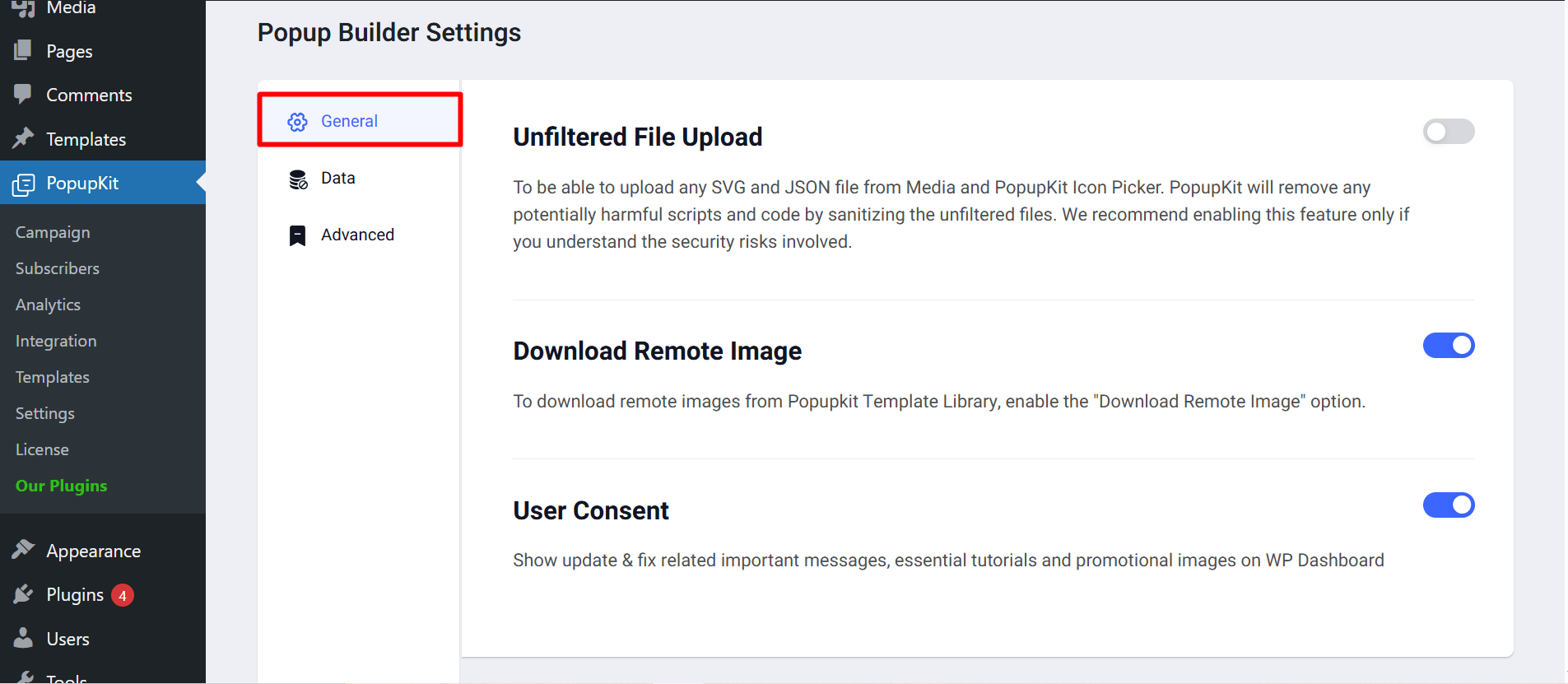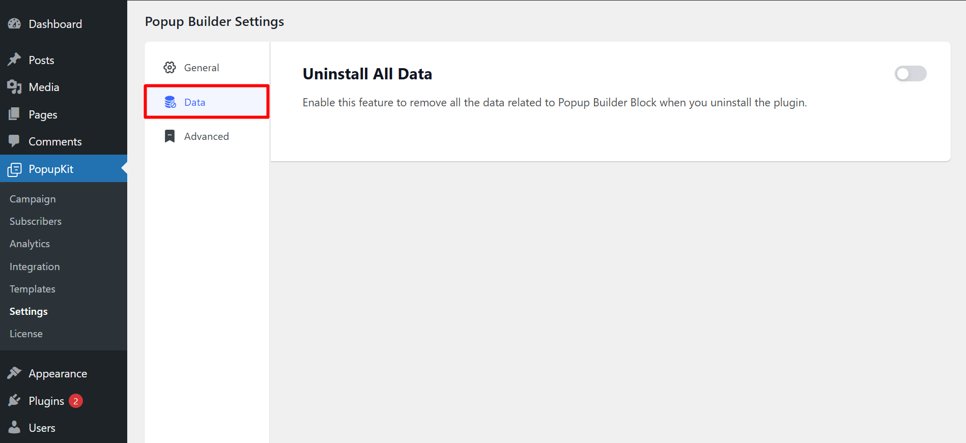 Uninstall All Data – While uninstalling the PopupKit plugin this setting allows you to delete the data related to the block.