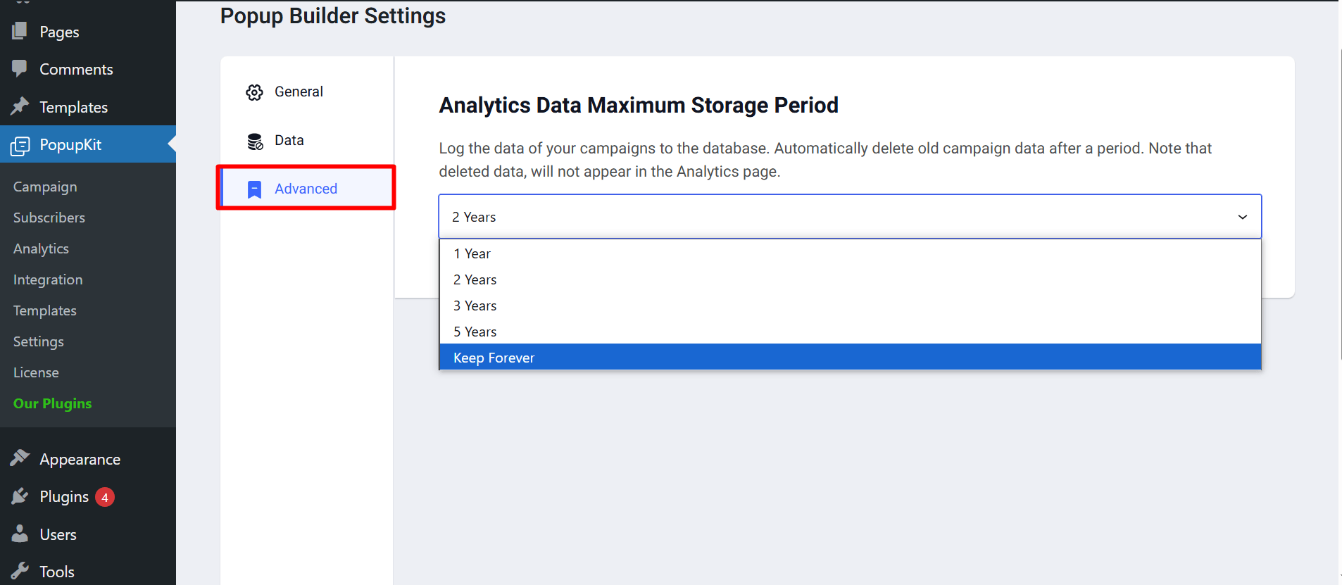 Analytics Data Maximum Storage Period: It allows you to set how long you want to store campaign data in the database. Old data is automatically deleted and won’t appear in the Analytics page.