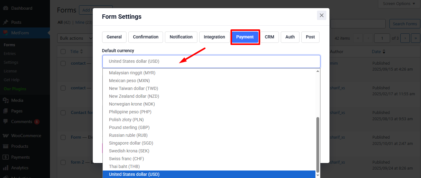 Go to the Payment tab. There are Devise dynamique choix. La fonctionnalité de devise dynamique permet aux gens d'effectuer des paiements sur votre site via Stripe.