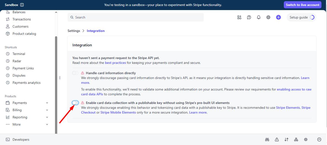 Here, you have to Enable card data collection with a publishable key without using Stripe’s pre-built UI elements.