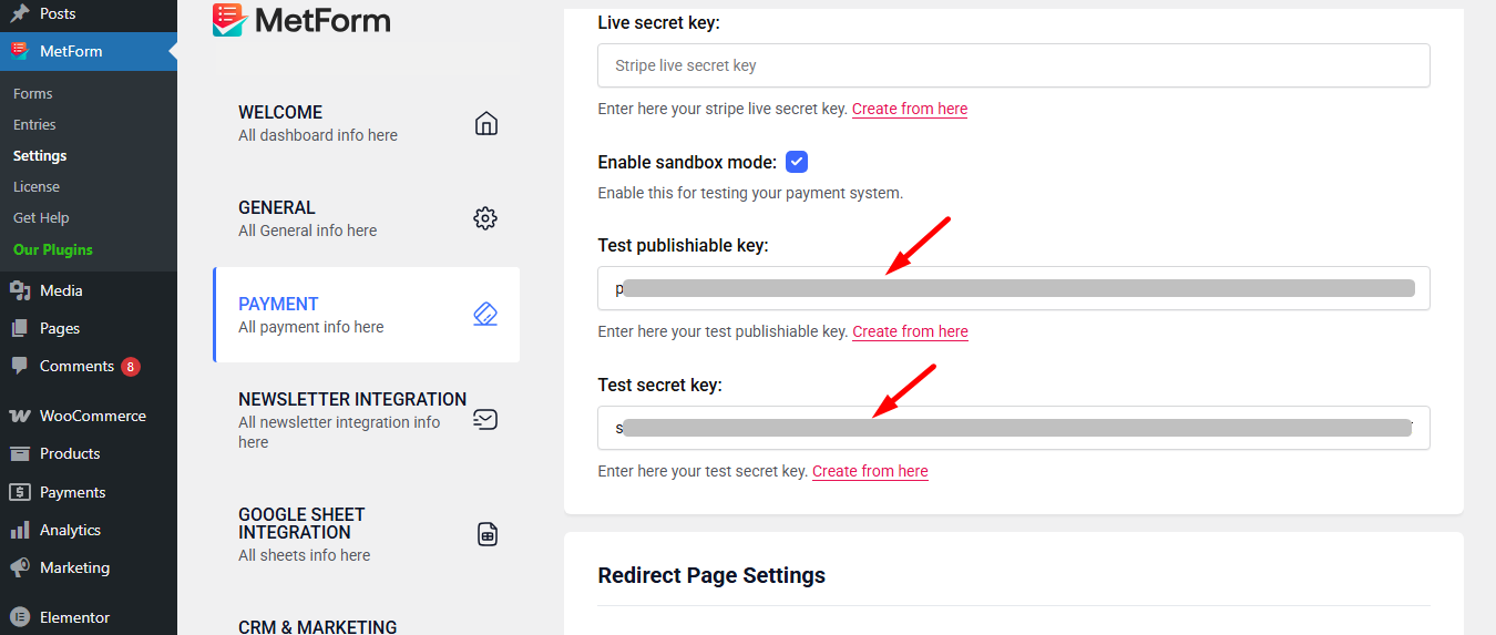 Now go back to Step 1, insert your copied Test publishable Key et Test secret Key