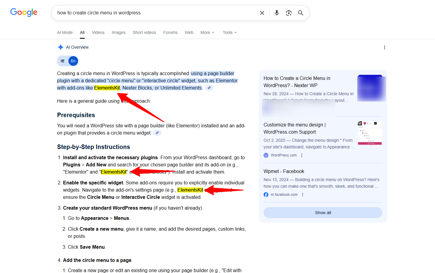 The above image shows how Wpmet’s blog’s step-by-step outline helps to feature our product in AI Overview. ElementsKit has been mentioned multiple times in the Google AI Overview’s step-by-step instructions.