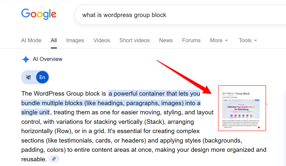 Here’s a real example, for the keyword, “How to create gamified popups in WordPress” Wpmet’s blog ranked first. Therefore, our product PopupKit gets mentioned in the AI Overview.