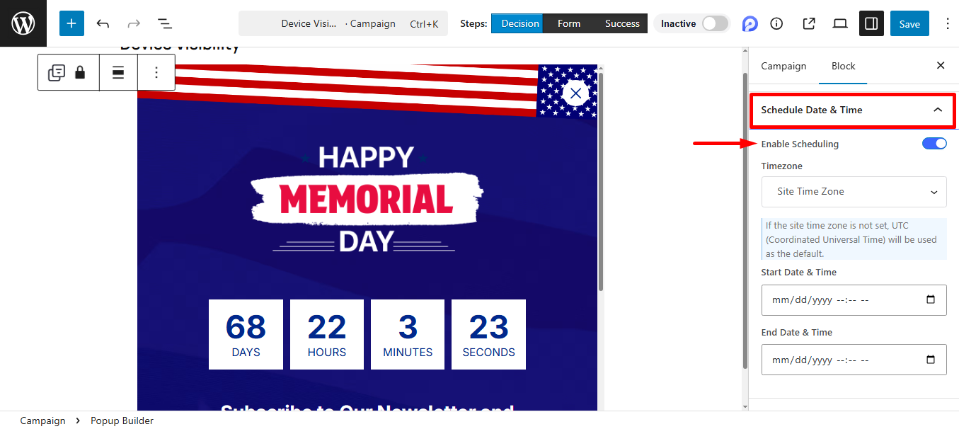 You have to expand the tab and enable ‘Enable Scheduling’ button. The controls here are: Timezone, Start Date & Time, End Date & Time.