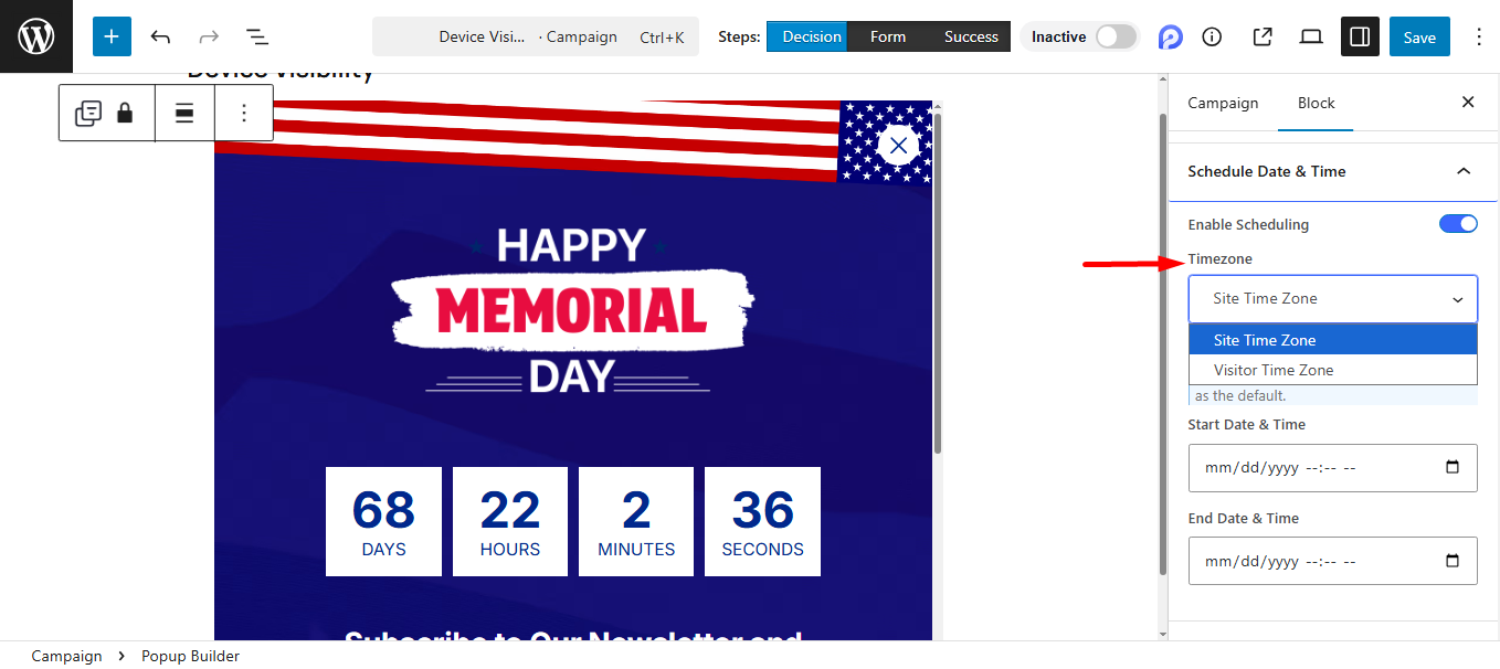 Con un Schedule Date and Time feature you can set when a popup should start and stop showing, and whether it follows your site’s time zone or the visitor’s local time zone.