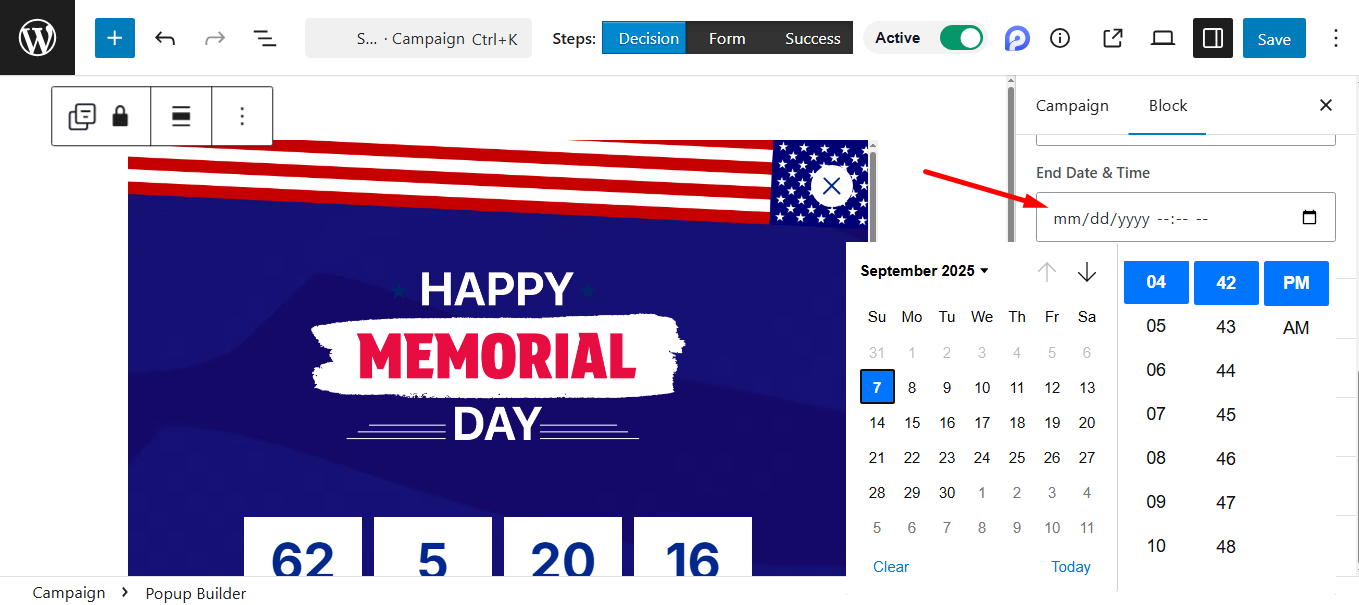 Here you need to adjust the time when the popup will stop showing. For example, it’ll end at 7 September, 04.42 PM.