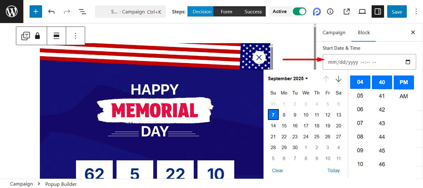 Set the time from the calendar when the popup will begin showing. For example, it’ll start from 7 September, 04.40 PM.