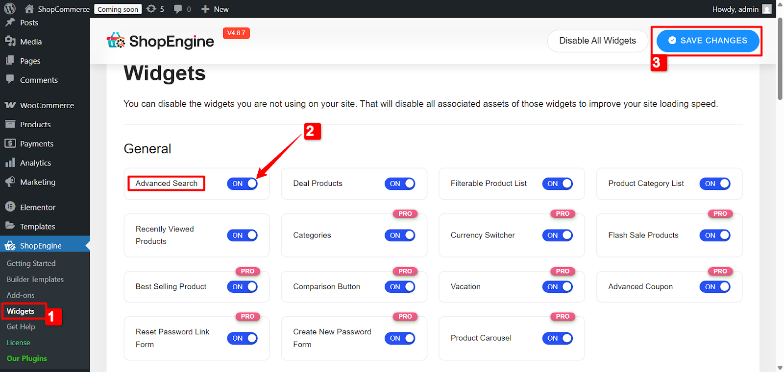 To use the advanced product search for WooCommerce, you need to enable the Advanced Search widget from the ShopEngine dashboard.