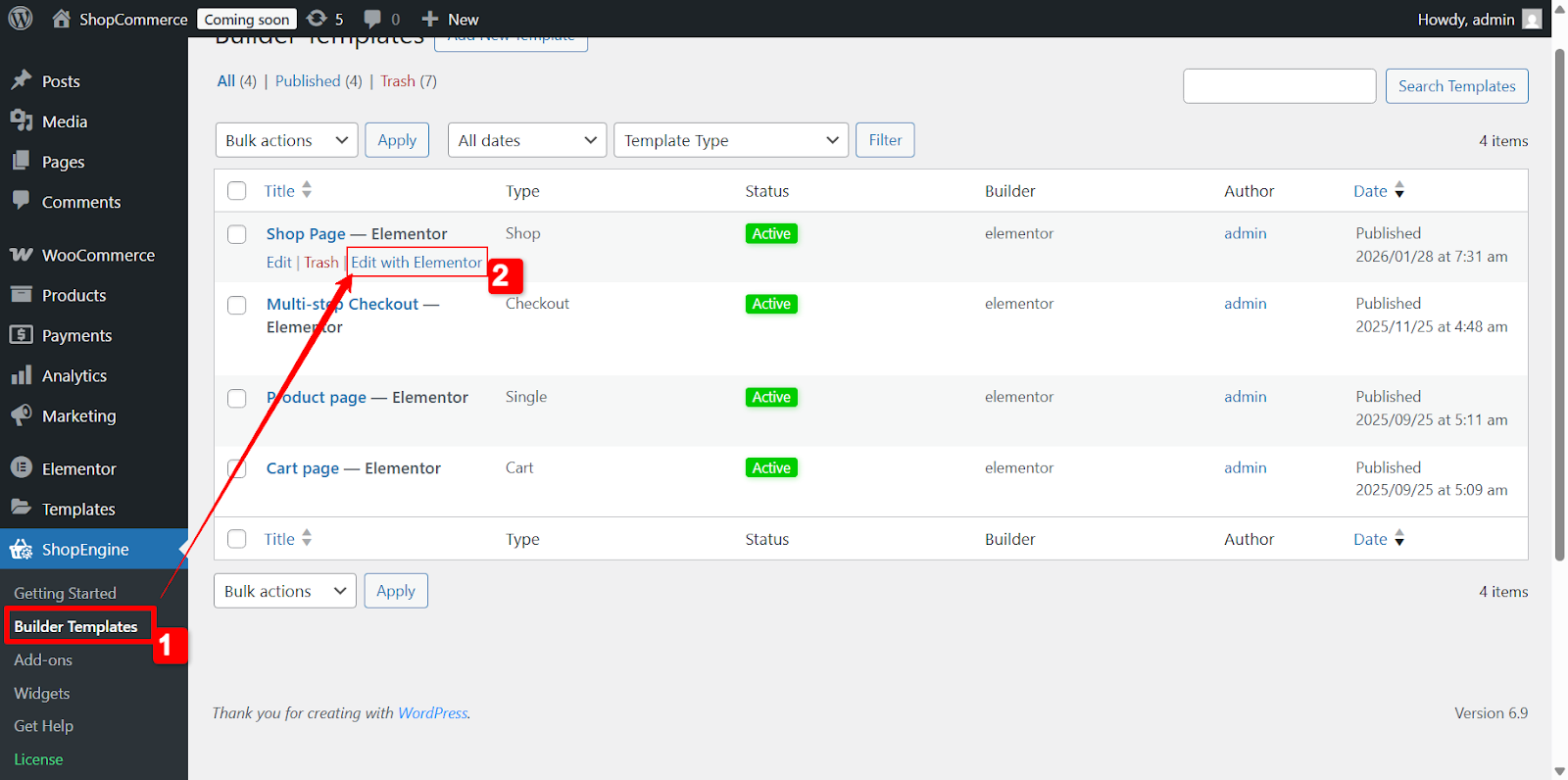 - Vai a ShopEngine → Builder Templates dalla dashboard di WordPress.