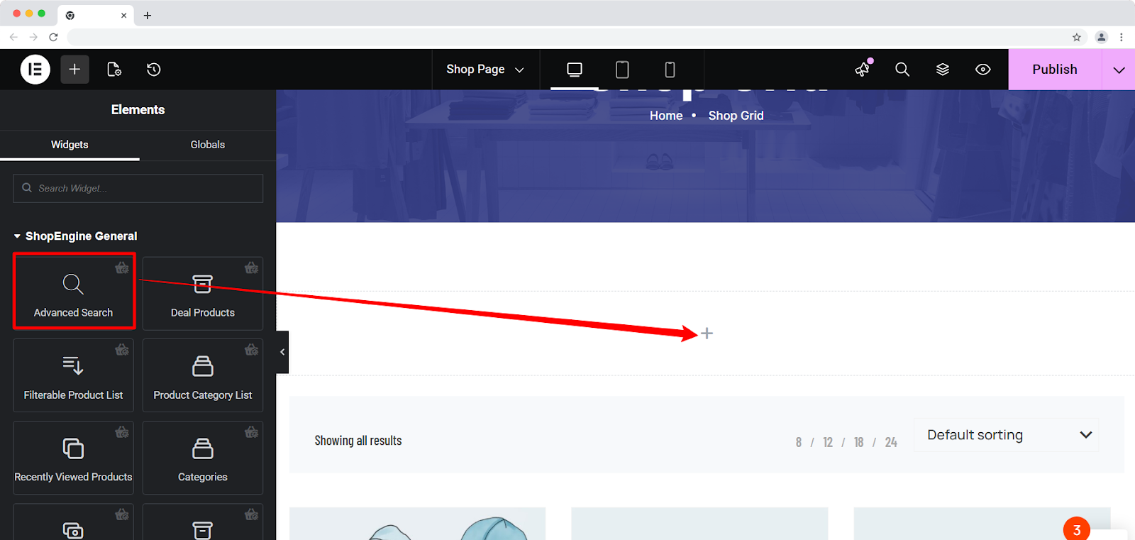- Trascina e rilascia il widget: Open the shop page template in Elementor editor. Then drag and drop the widget in the layout.