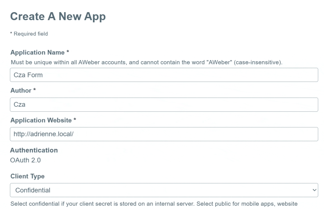 - Log in tothe AWeber developer portal and create a new app. Sign up if you don’t have an existing account.