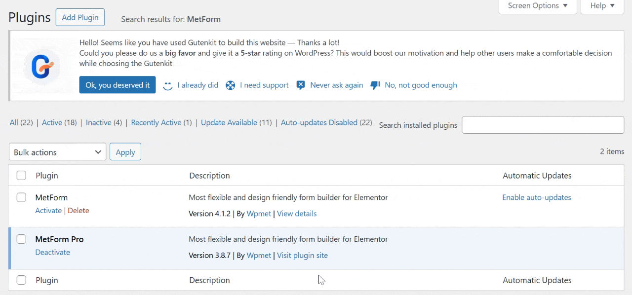 - Install MetForm in your WordPress site and activate it.