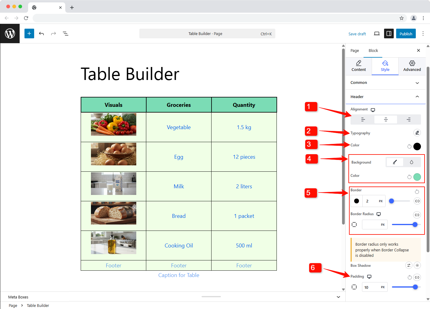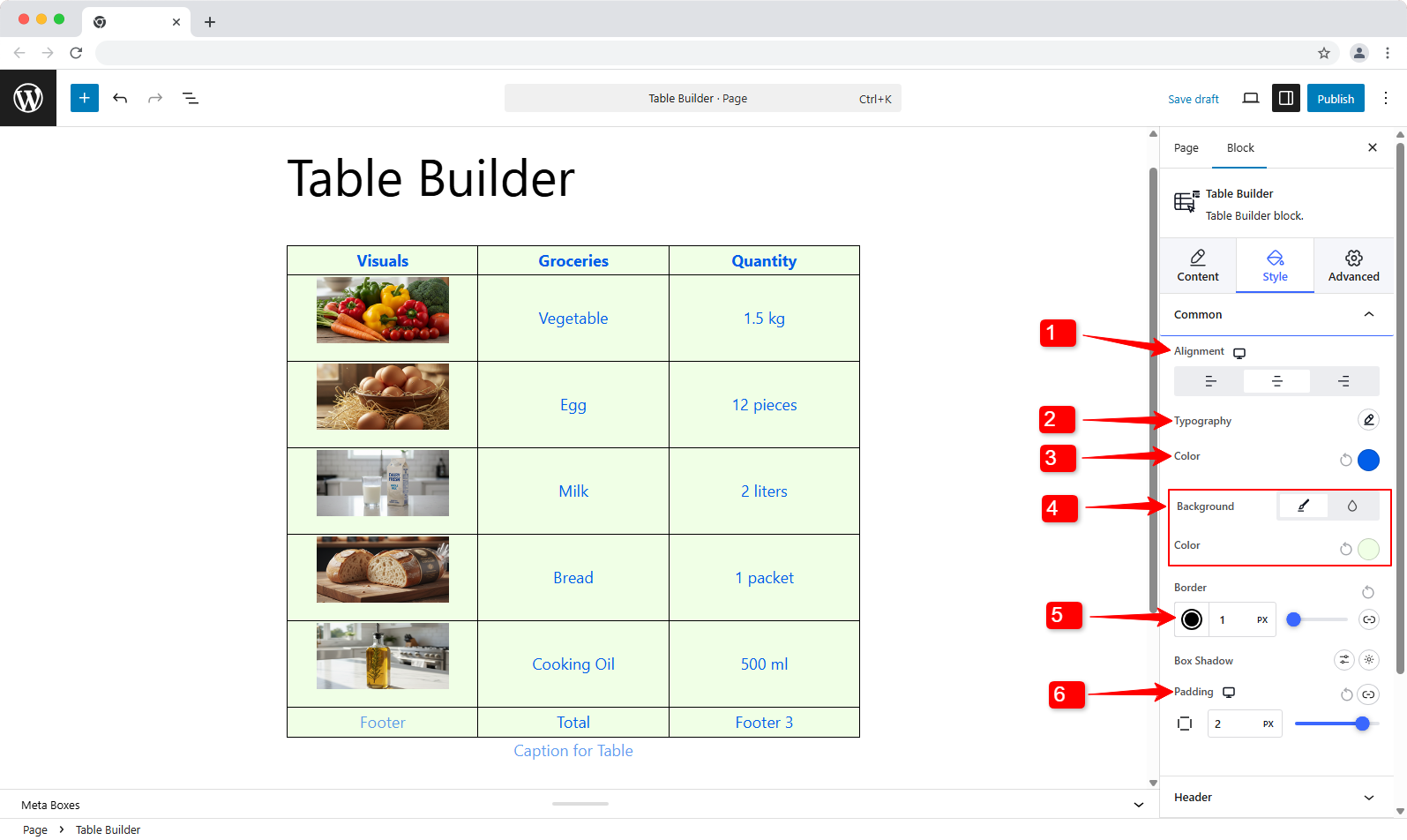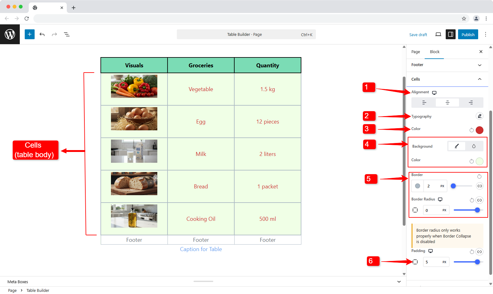 For every cell in the table, you can control the following settings under the Common section under the Style tab: