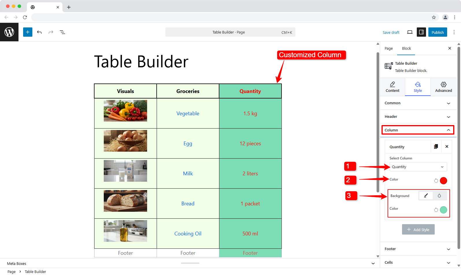 With TableKit, you can customize each column individually for your WordPress table. To customize a column, go to Style → Column in the block editor.