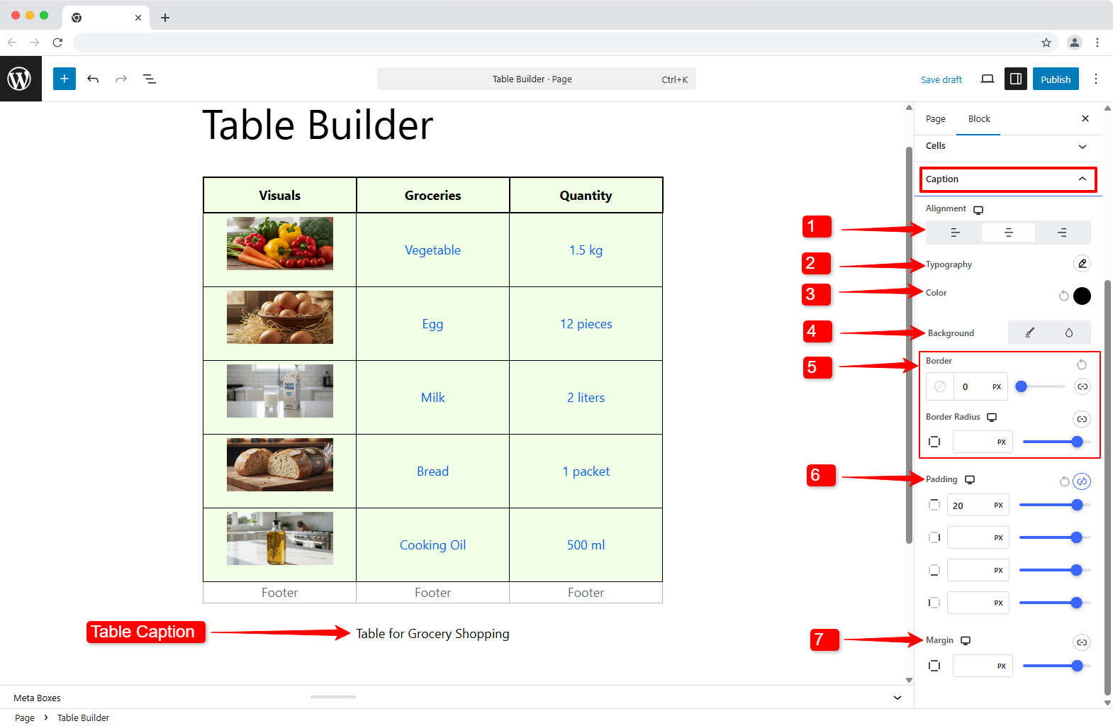 6. Enable Caption: You can enable caption for the table. If you enable caption, choose whether to place the caption at the top of the table or at the bottom of it.
