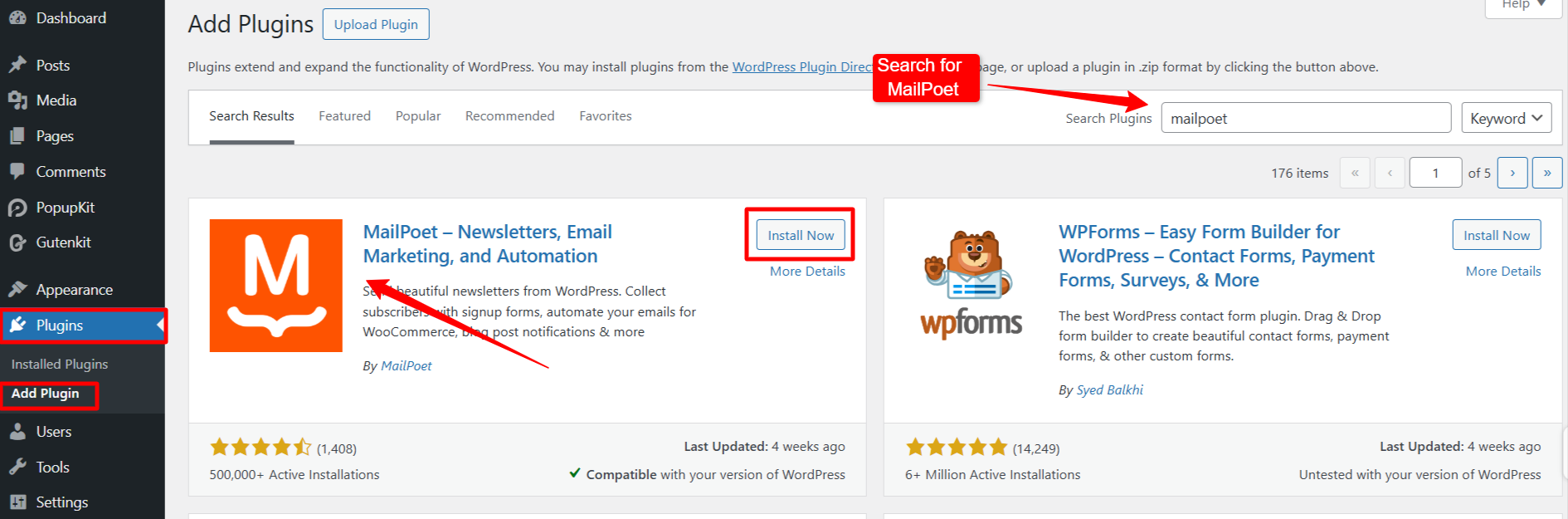 To connect PopupKit with MailPoet, the MailPoet plugin must be installed on your WordPress site: