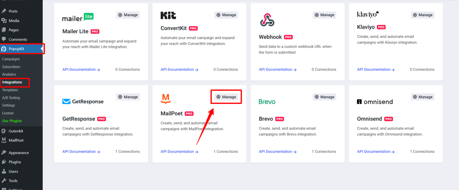 이동 PopupKit Settings in the WordPress dashboard and click on the 통합 tab. Find 메일시인 in the list of available integrations. And, click on the “Manage” 옵션.