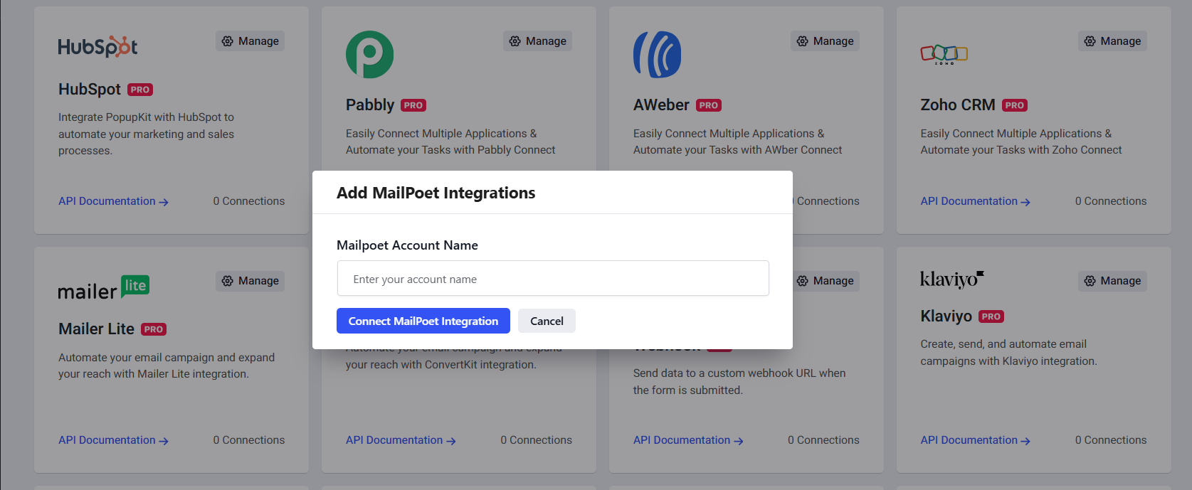 Then, enter your MailPoet Account Name and hit the “Connect MailPoet Integration"버튼.