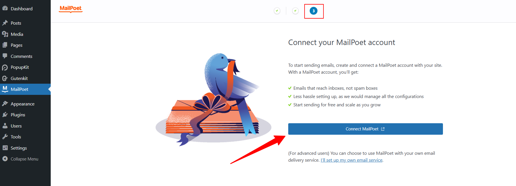 In the third stage, you’ll be asked to connect your MailPoet account. Click on the “Connect MailPoet,” and you’ll be moved to the account setup page. Log in with your credentials or sign up for a new account.