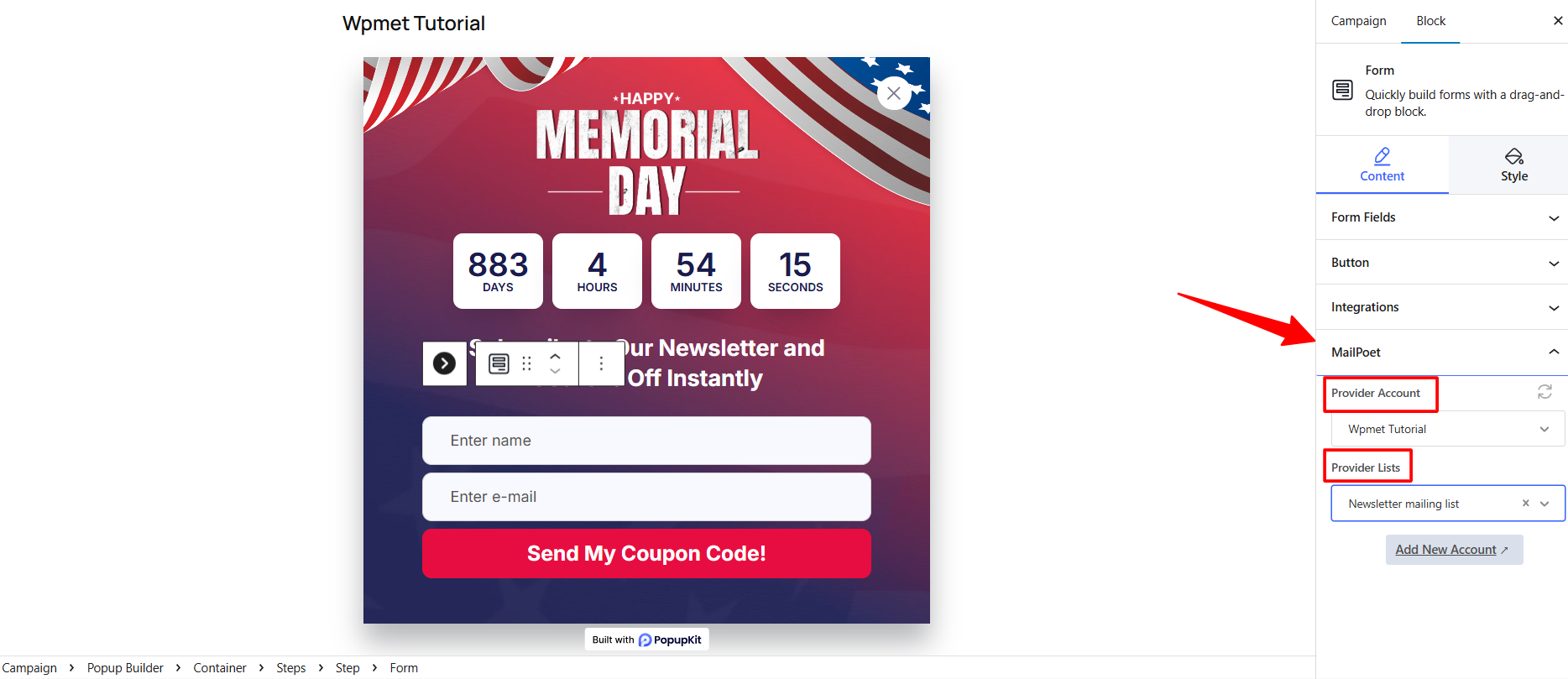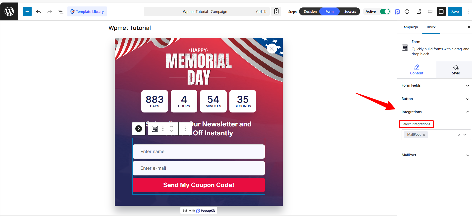 Step 4: Configure MailPoet in the PopupKit Editor #