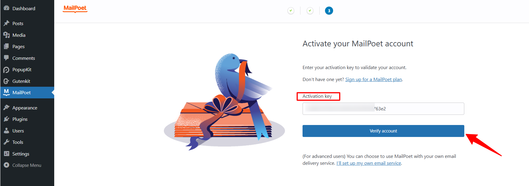 At this point, you need to insert the API Key in the MailPoet plugin settings. Paste your copied API and hit the “Verify Account"버튼.
