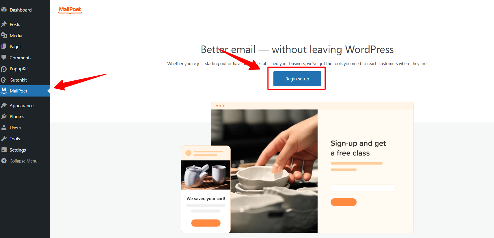 Once MailPoet is activated in your WordPress site, click on it from the dashboard. And, you’ll see a screen like below: click Begin Setup.