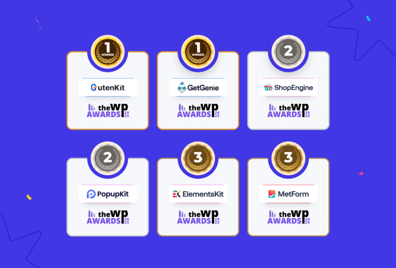 ~에 The WP Awards,MetForm and ElementsKit won 3rd place Bronze, ShopEngine and PopupKit received 2nd place Silver, and GutenKit along with GetGenie achieved 1st place Gold. These accolades reflect our commitment to innovation, quality, and delivering the best experience for WordPress users worldwide.