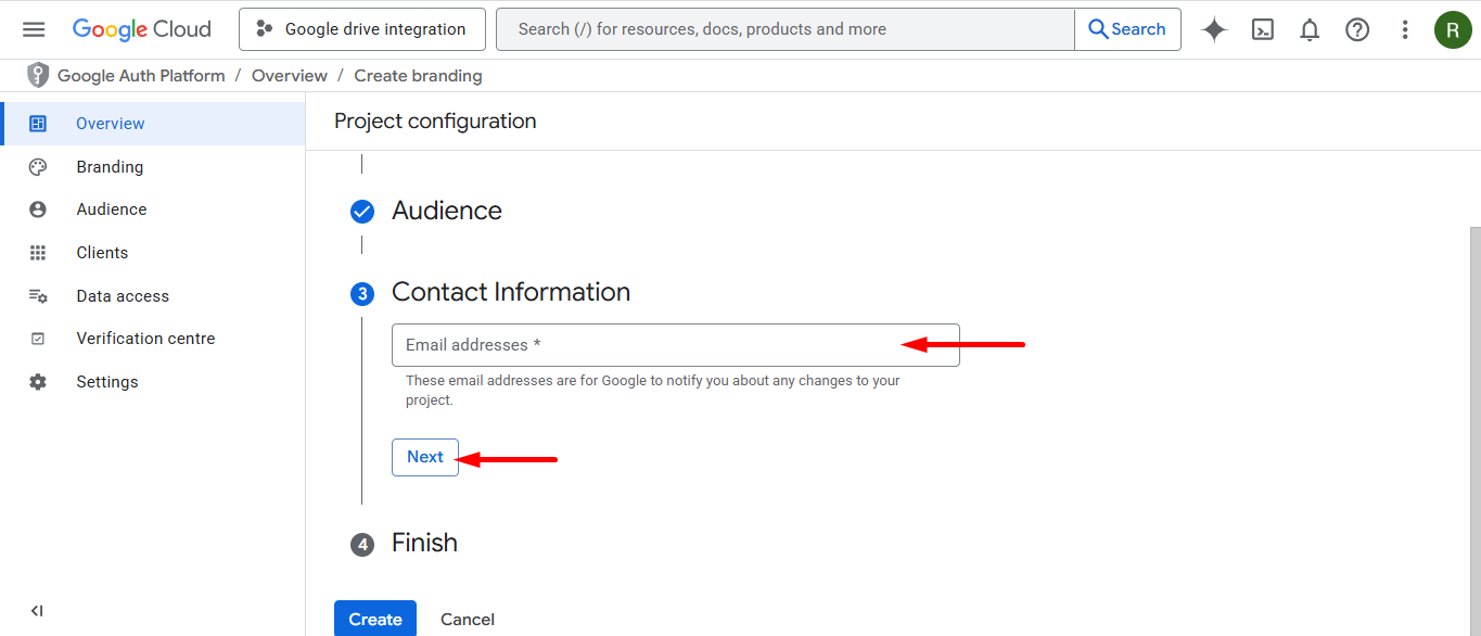 Enter an email ID in the field. Google will use this address to send important notifications regarding changes to your project.