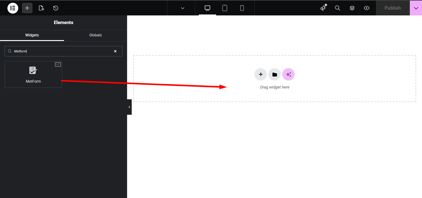 On the Elementor widget search field, search for MetForm. Drag and drop it on the Elementor content area.