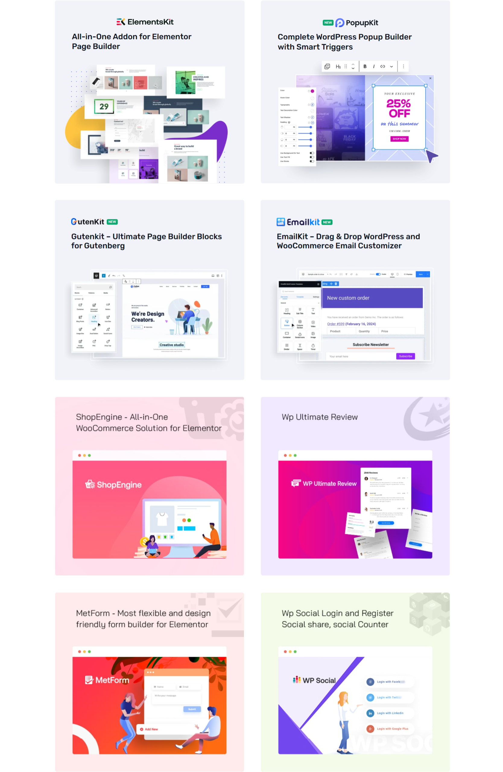ElementsKit is an all-in-one addon for Elementor. It provides you with Ponad 85 widżetów, ponad 500 gotowych sekcji i ponad 35 gotowych stron. Co więcej, otrzymujesz najbardziej zaawansowany kreator stopek nagłówków i mega kreator menu dla Elementora.