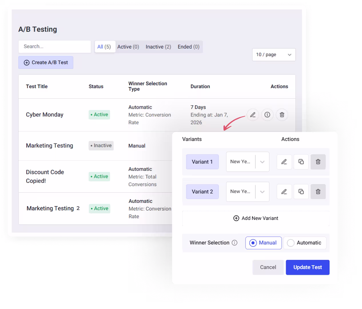 decision-making required once the test starts. - Goal-Based Optimization – Set the winning metric (Conversions, Views, or Conversion Rate) that