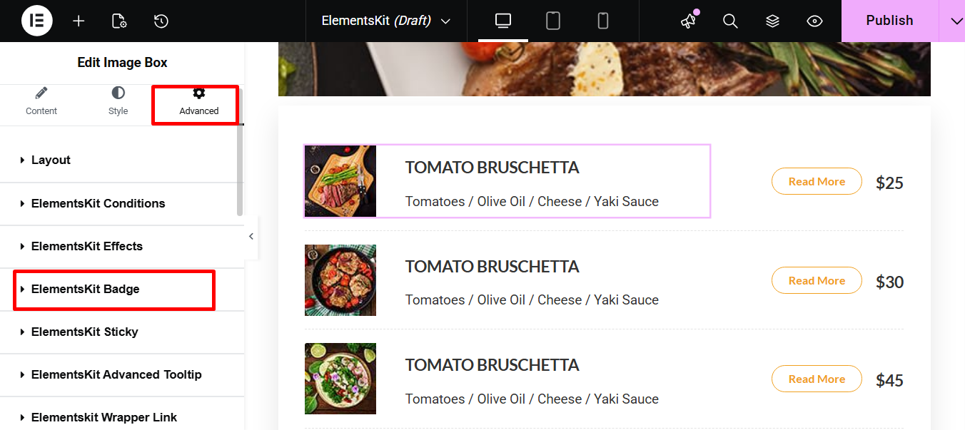 Navegue até o Guia Avançado. Here you’ll find the ElemetsKit Badge.