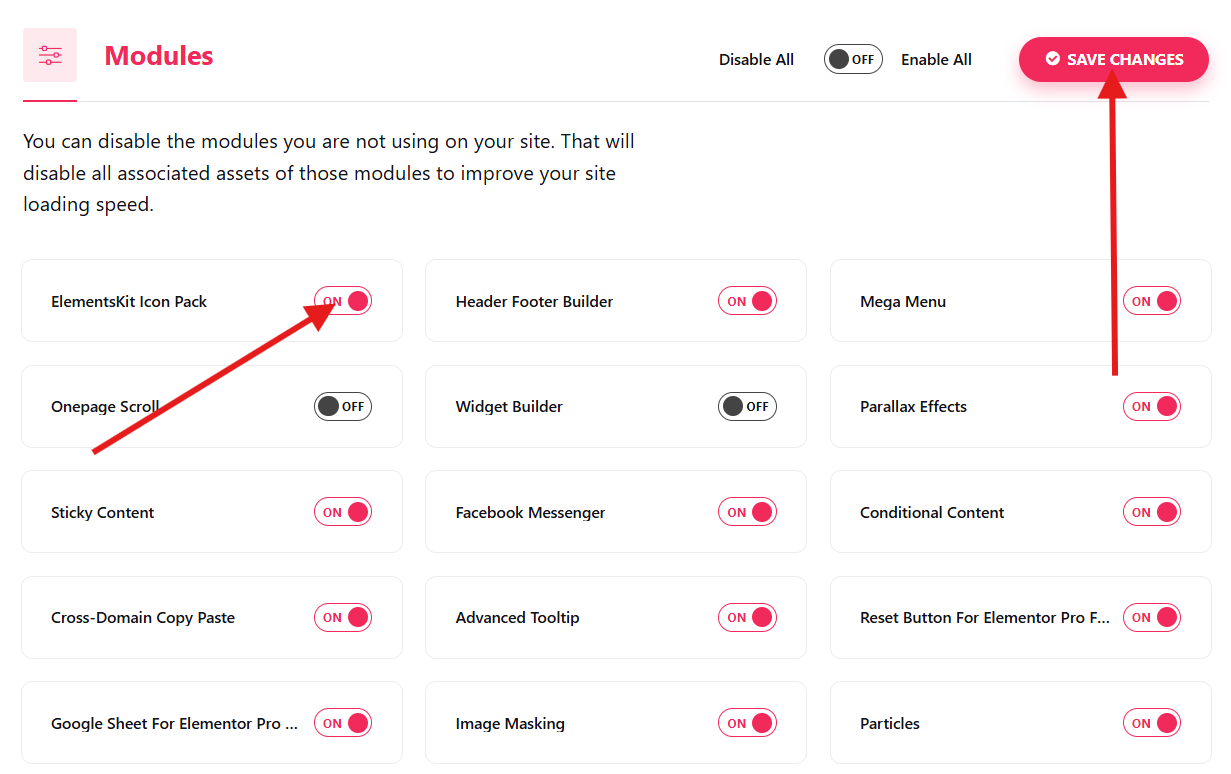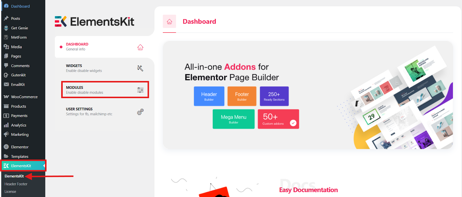 Navigera till din WordPress-instrumentpanel och gå till ElementsKit. Open Moduler to select ElementsKit Icon Pack.