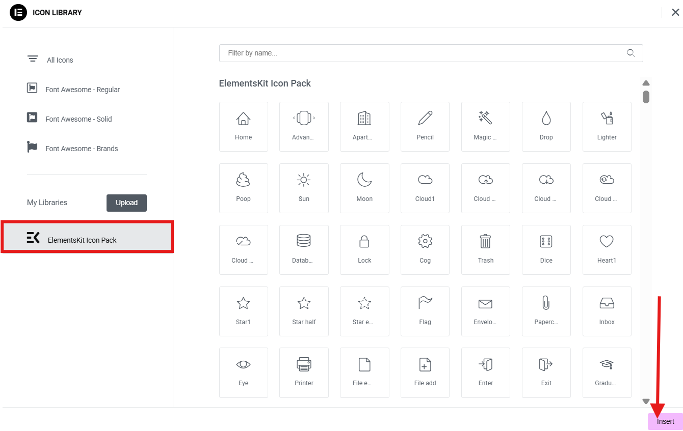 Välj sedan ElementsKit Icon Pack and choose the icon you prefer to insert.