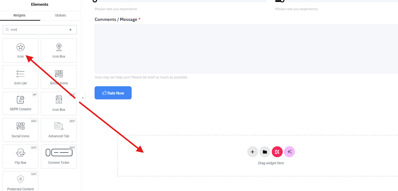 But if you want to add an icon in a separate section, simply search for the icon widget and drag-and-drop it to the center.
