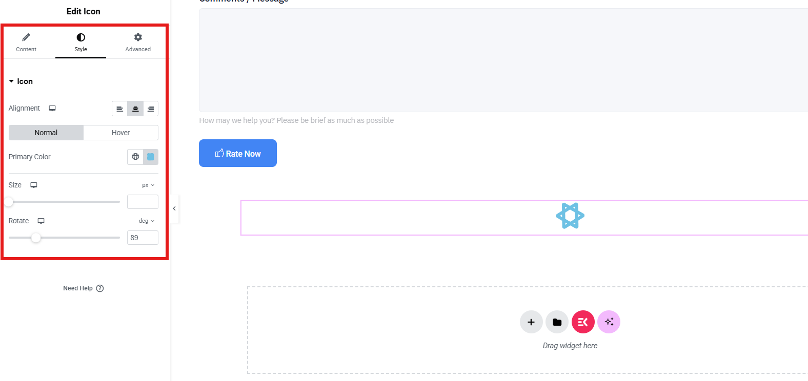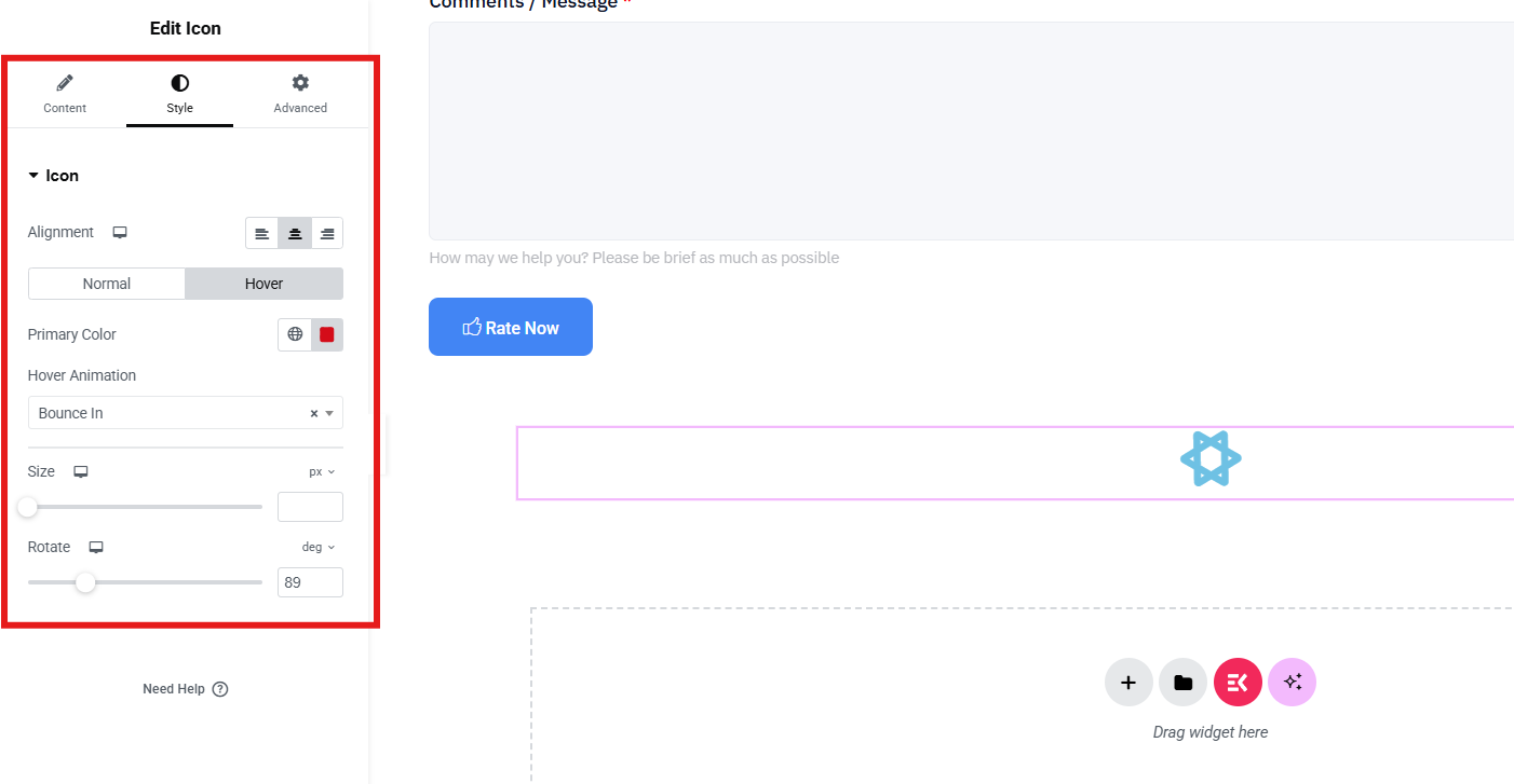 Dra och släpp Icon widget onto your section. In this method, you can customize and design your icon through the stil och advanced settings sektion.
