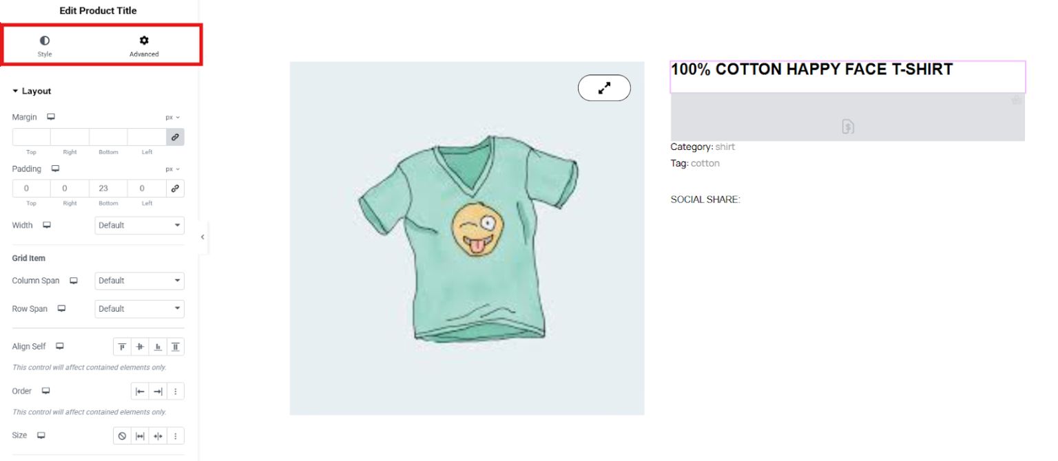 You can now customize the single product you just added. You can adjust its layout, alignment, color, typography, and even add motion effects, background, etc., through its style and advanced settings.